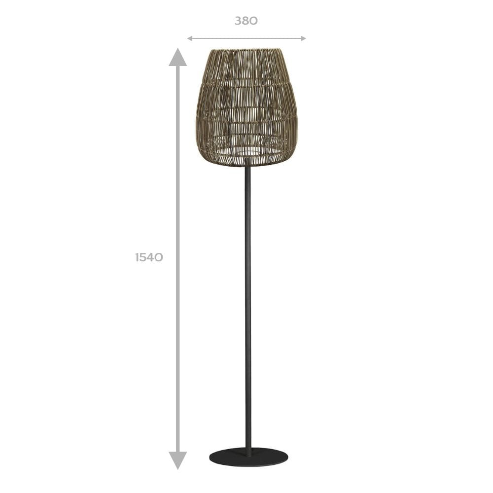 De lamp wordt compleet geleverd met scherm, klaar voor gebruik. Het kunstrotan scherm wordt stevig bevestigd met een speciale metalen beugel die zorgt voor een stabiele verbinding. De zwarte poedercoating biedt een extra beschermlaag tegen roest en slijtage.