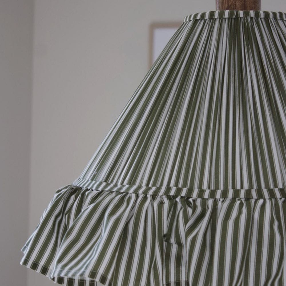 Het hart van de Hanglamp Estrid Mosgroen is de kap van hoogwaardige gestreepte stof, die zorgt voor een unieke, tactiele uitstraling. De karakteristieke rucherok langs de onderkant geeft de lamp een sierlijk en zacht silhouet. In combinatie met het warme mangohout ontstaat er een perfecte mix van retro stijl en natuurlijke elegantie.