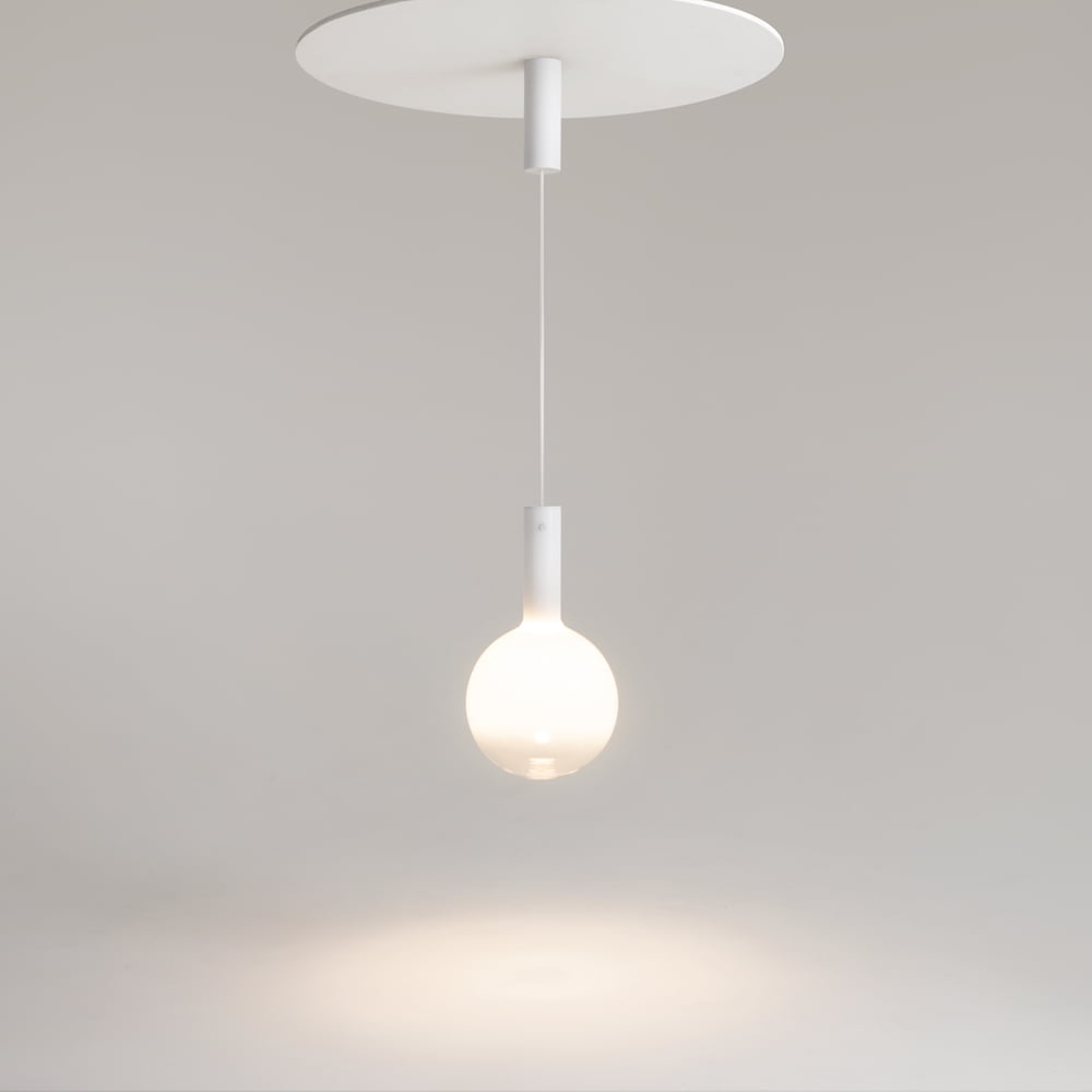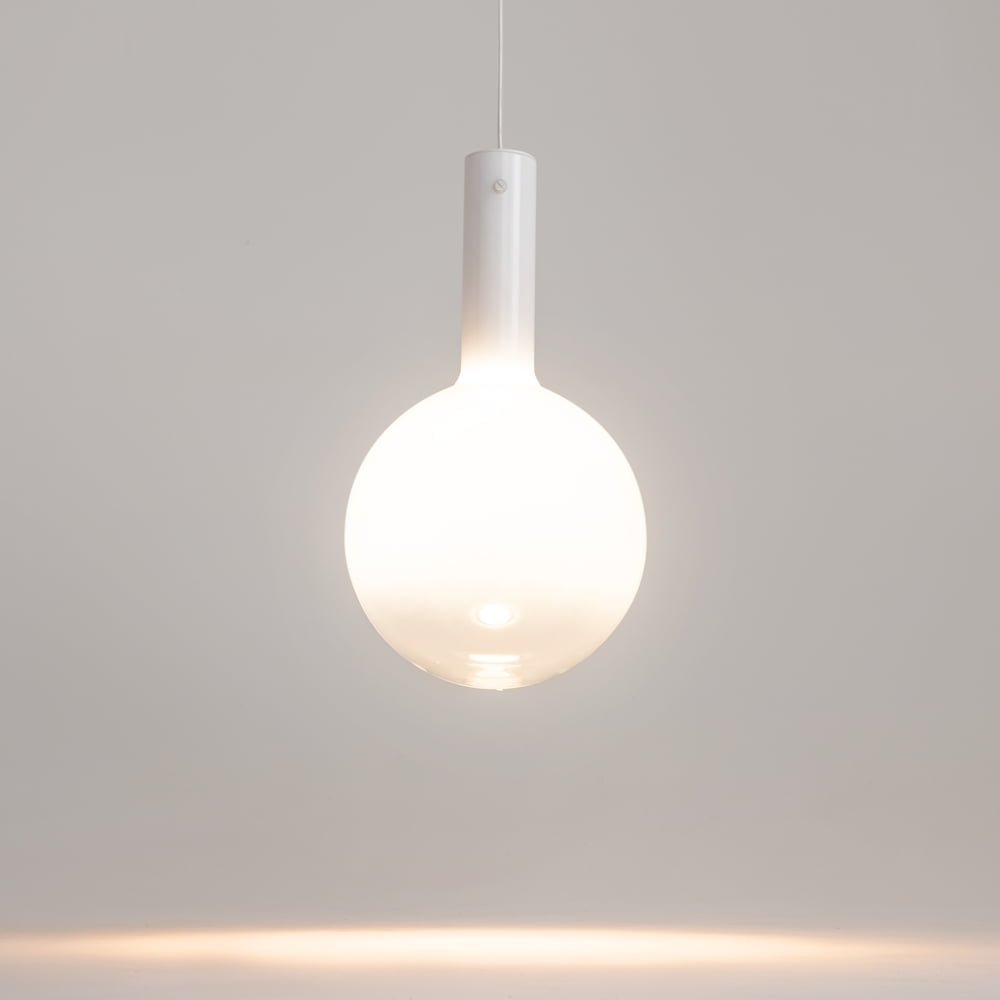 - De bolvormige lampenkap van geblazen glas die vloeiend overgaat in de hardwareledhouder.