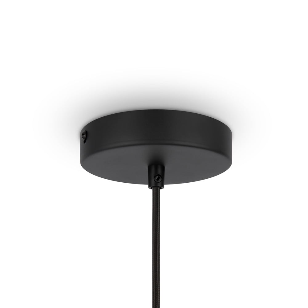 - Hanglamp uit de serie Roots van de Duitse fabrikant Maytoni is uitgevoerd met een zwart metalen plafondkap met daaronder draaibare houten ringen als lampenkap.