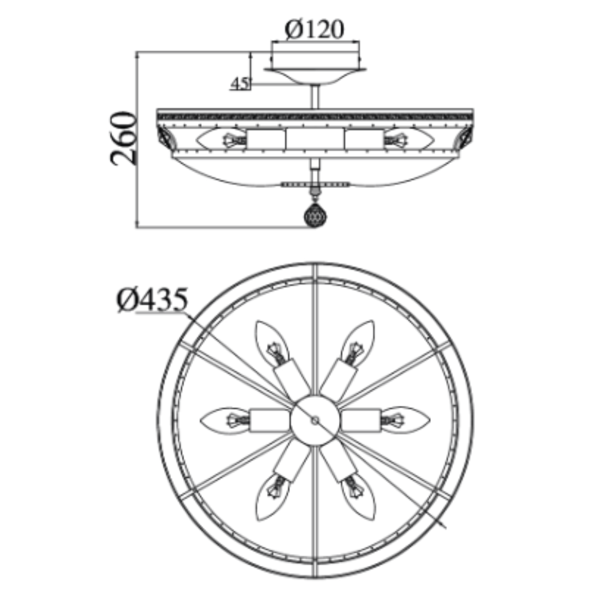- De plafondlamp heeft 6 lichtpunten met een E14 fitting en een totaal vermogen van 360W.