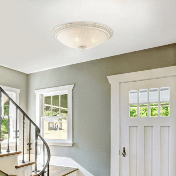 • Een matglazen kap met een gezandstraald bloemmotief verbergt de interne elementen van het frame en verspreidt zachtjes het licht van de lamp.