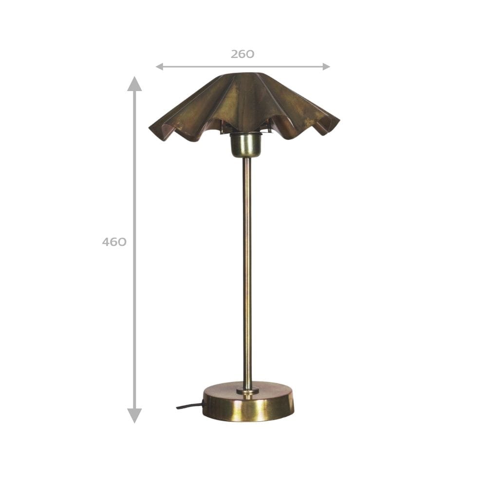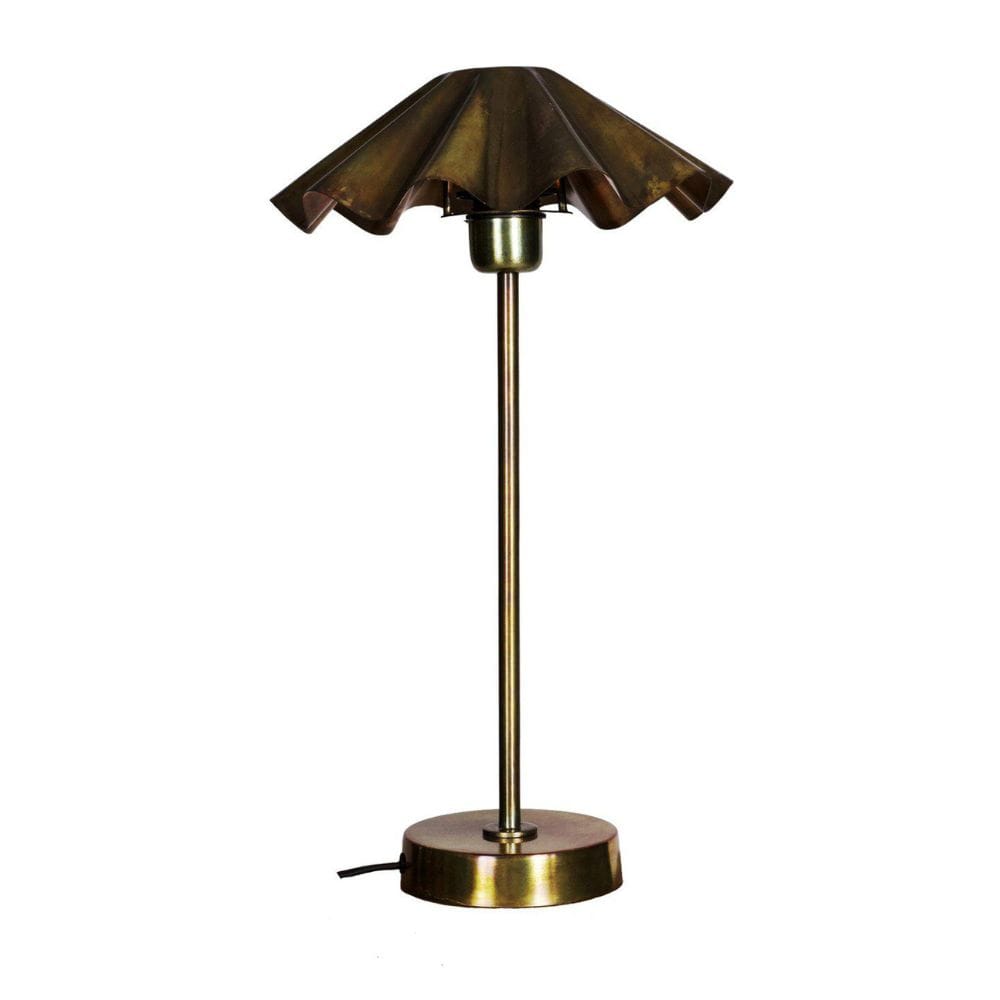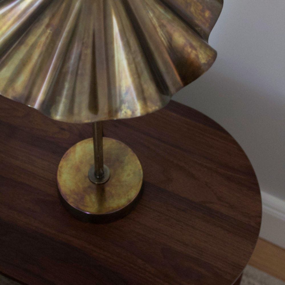 Til je interieur naar een hoger niveau met de Tafellamp Aira in gebrand messing. Deze opvallende lamp is volledig vervaardigd uit metaal met een boeiende afwerking die glinstert met iriserende tinten van diep blauw, groen en koper. Zowel de basis als de karakteristieke geplooide kap vormen samen een sculpturaal en samenhangend kunstwerk dat met het licht mee verandert. Met een hoogte van 46 cm en een kapdiameter van 26 cm maakt deze Aira een gedurfd statement, zelfs in compacte ruimtes.