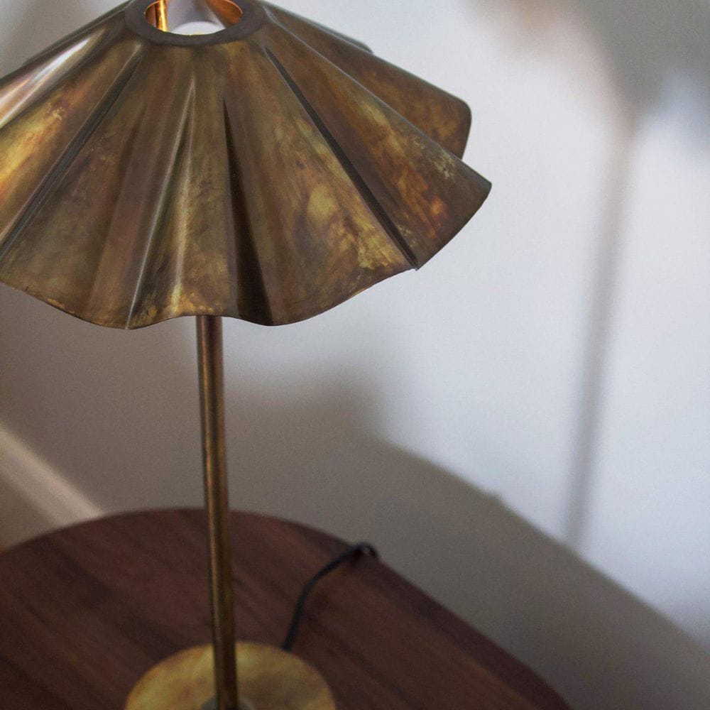 De Tafellamp Aira is meer dan verlichting; het is een dynamisch kunstobject. De unieke gebrande messing afwerking creëert een iriserend, veelkleurig effect dat voortdurend verschuift, afhankelijk van uw perspectief en het invallende licht. De geplooide, ‘cupcake’-vormige kap voegt een speelse, tactiele structuur toe en versterkt het artistieke karakter.