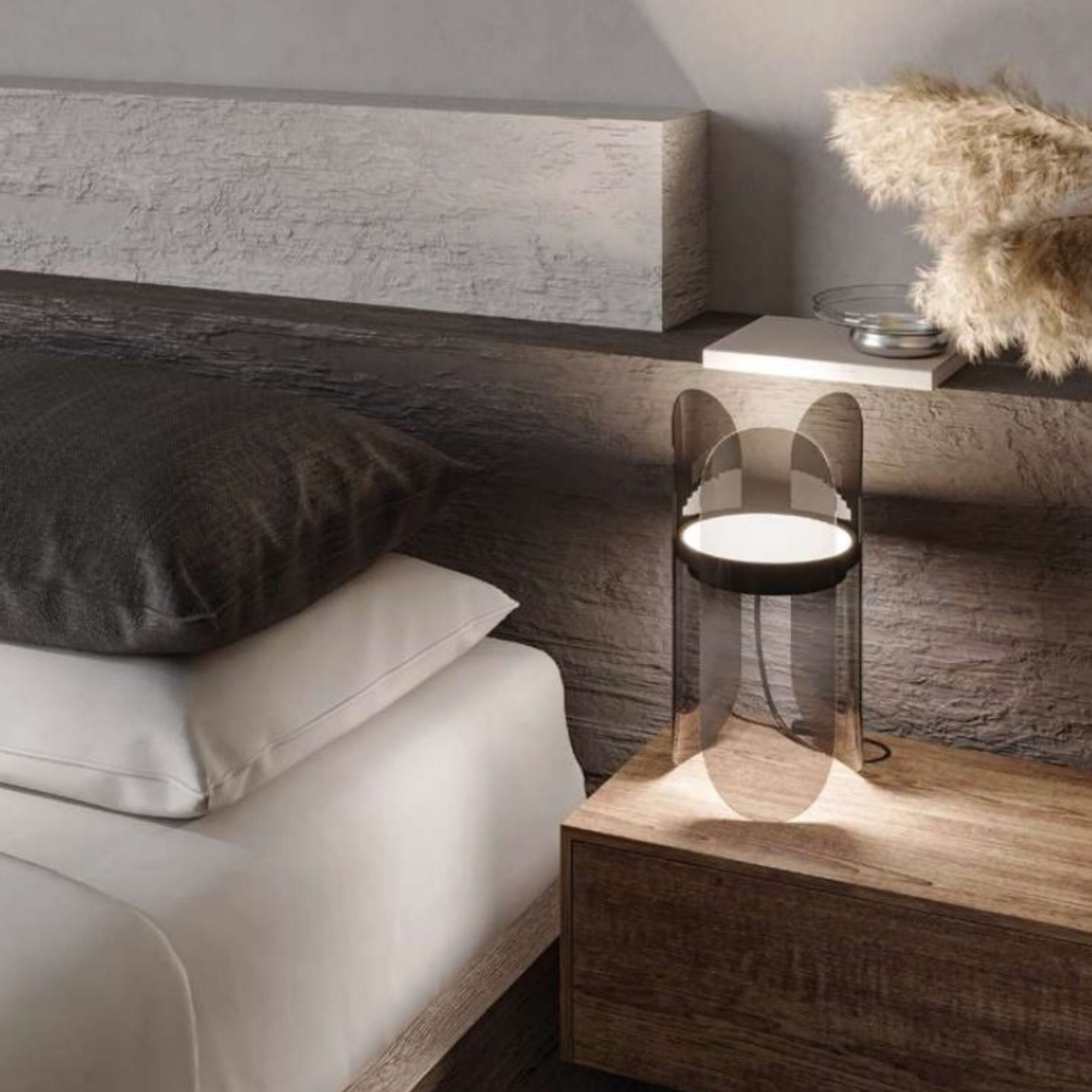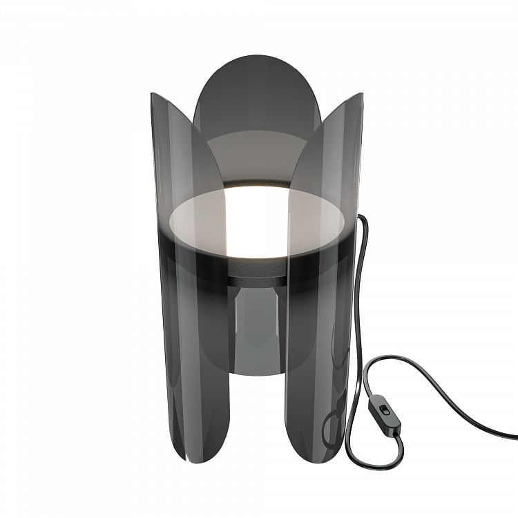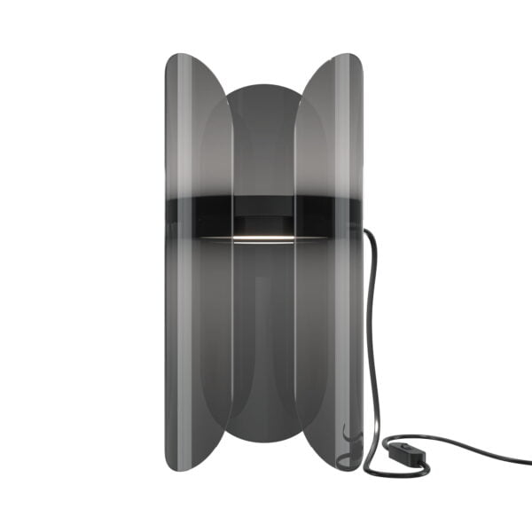 - Originele LED tafellamp, gemaakt van een zwart metalen voet met gerookte decoratieve acryl elementen en een matte diffusor met tweezijdige lichtverdeling.