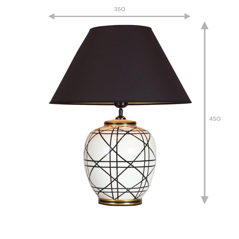 De urnvormige keramische voet is een ode aan klassieke schoonheid, maar krijgt door het gedurfde, grafische zwart-wit patroon een eigentijdse, bijna artistieke rand. Het is deze unieke combinatie van tijdloze vorm en moderne grafische signatuur die de lamp zo onderscheidend maakt.